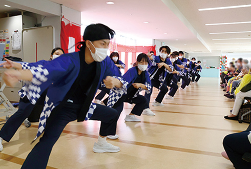 午後の部では、賀寿表彰以外の患者さんを対象に病棟イベントを開催。リハビリ職員から、毎年恒例となっているハンドベルと、もはや竹川病院の伝統舞踊となっているソーラン節を披露しました。各病棟所属の職員が披露したということもあり、患者さんだけでなく、イベントを楽しみに来院されたご家族も親近感を持って楽しまれていました。賀寿表彰対象の患者さんより若い患者さんがいたからか、一緒に踊っていただいた患者さんもいらっしゃりと、午前同様大いに楽しんでいただけたようです。