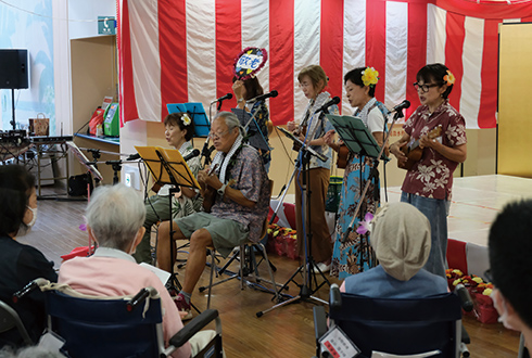 さらに『REI マカ・ロア 祝賀のフラ』、職員による出し物『リハ職員4名によるリハビリ体操 ~ 「365歩のマーチ」「BTS Dynamite」~ 』と続き、最後は地元で活動されているウクレレ&オカリナ グループ『hano hano (ハノハノ)』の皆さんが「パーリーシェルズ」「バラが咲いた」など5曲を演奏してくれました。ウクレレとオカリナの演奏にのせて6名の皆さんの大きな歌声が会場に皆さんに伝わり大変盛り上がりました。来年も職員一同で患者さんやご家族の皆さんが楽しんで頂けるような病院祭を開催していきたいと思います。