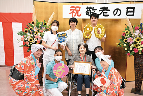 ご長寿の祝賀は、最高齢99歳の患者さんを筆頭に、白寿から傘寿までの節目のお祝いの患者さん計24名を、皆さんの代表として表彰させて頂きました。病院長より、ご長寿の患者さんに表彰状を授与。あわせて院内保育園の園児手作りのお祝いメダルと記念品を贈呈しました。複数のご家族からも祝辞とお便りを頂戴し、職員が代読してご紹介。最後に、表彰者代表の方から立派な御礼の言葉を頂戴しました。終始和やかな雰囲気の中、ご家族ともご一緒にご長寿のお祝いを開催することができました。