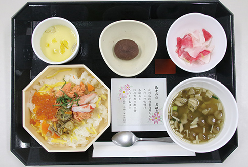 昼食は、当院栄養科が技と真心を込めた特製「お祝膳」の、にぎり寿司、いくらおろし、天麩羅盛り合わせ、茶碗蒸し、すまし汁、デザートを提供させて頂きました。 笑顔で召し上がるご様子から、ご満足頂けたものと思います。