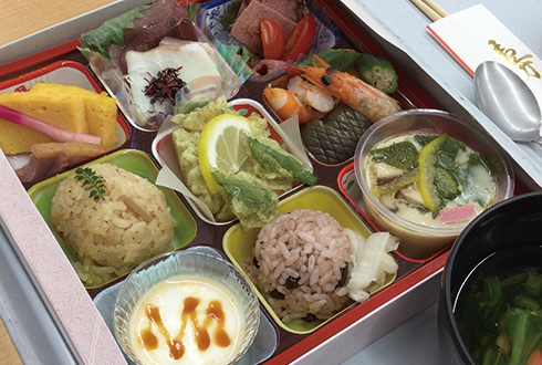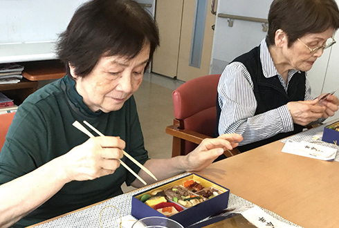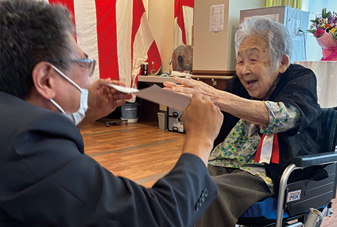 通所リハビリでは31名の節目の方がおられ、式典では8名、他利用時間帯では7名の方々をお祝いしました。式典に参加された方には、「本日はお声がけ下さりありがとうございます。とても嬉しいです。」とこの日の為にいつもとは違うシックなお洋服でお越しになり、少し緊張されているご様子もうかがえました。また節目を迎えられたお一方より「演歌」のご披露頂き素晴らしい歌声に皆さん「凄い!」と感動されていらっしゃいました。お食事では、参加者全員が「美味しい、美味しい」「多いと思ったけれど食べちゃいました」と素敵な笑顔が溢れる時間でした。
