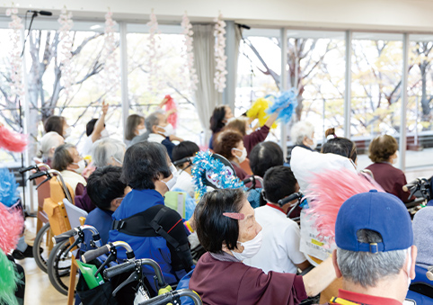 患者さんやご利用者は、ポンポンやうちわを振りながら楽しげにリズムに乗り、終始笑顔で演奏会を堪能されていました。