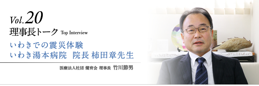 柿田先生が健育会グループに入職され9年。その間、熱川温泉病院、竹川病院、花川病院と、現在のいわき湯本病院の4病院で院長を歴任して頂いています。昨年、いわき湯本病院が東日本大震災で被災した際には、連日病院に泊まり込んで奮闘して頂きました。今回は、柿田先生をお招きし、震災当時のお話や健育会グループの取り組み等について対談を行いました。(以下、敬称略)
