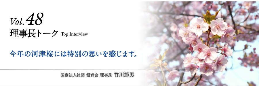 熱川温泉病院、西伊豆病院と、伊豆地方にゆかりのある健育会グループにとっても、この桜はなじみ深いものとなっています。そして、この「河津桜」をことのほか愛したのは、先代理事長である父でした。先代理事長は、1953年に竹川病院を設立し、そして2つ目の病院として1965年に明るく温暖な自然環境に恵まれた伊豆に熱川温泉病院を開設しました。