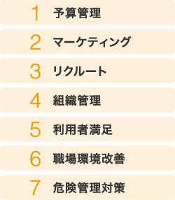 健育会グループでは、介護施設の施設長など介護事業に関わる責任者が、以下の7項目を適正に管理しているかを確認することを目的に、介護施設運営会議を月1回開催しています。この会議は、健育会グループの介護事業における経営方針の周知徹底を図ること、そして施設間での情報共有をすすめることによりノウハウの共有・蓄積を図るために大変重要な場となっています。