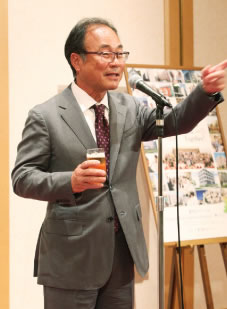 乾杯の前には、竹川理事長より、「審査員の先生方からのご指摘から、まだ我々のグループにもやるべきことが残っていると感じました。しかし、全体的に発表も質問も質が上がり、特に、質疑で発表者に切り込んでいくような質問があり感心しました。これからの発展に期待したいと思います。」などのお話があったあと、今年のスローガンである「Vision & Work Together with Smile! 」の「Vision & Work Together」を理事長がおっしゃった後に、皆で「with Smile!」を唱和し笑顔で乾杯しました。