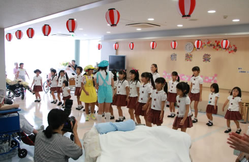- 午後は各病棟で病院祭のイベントを実施。三味線奏者や子供合唱団、また職員による演劇等を催しました。どの病棟でも、音楽に合わせながら、ご家族と一緒に一生懸命手拍子されている患者さんの姿が印象的でした。