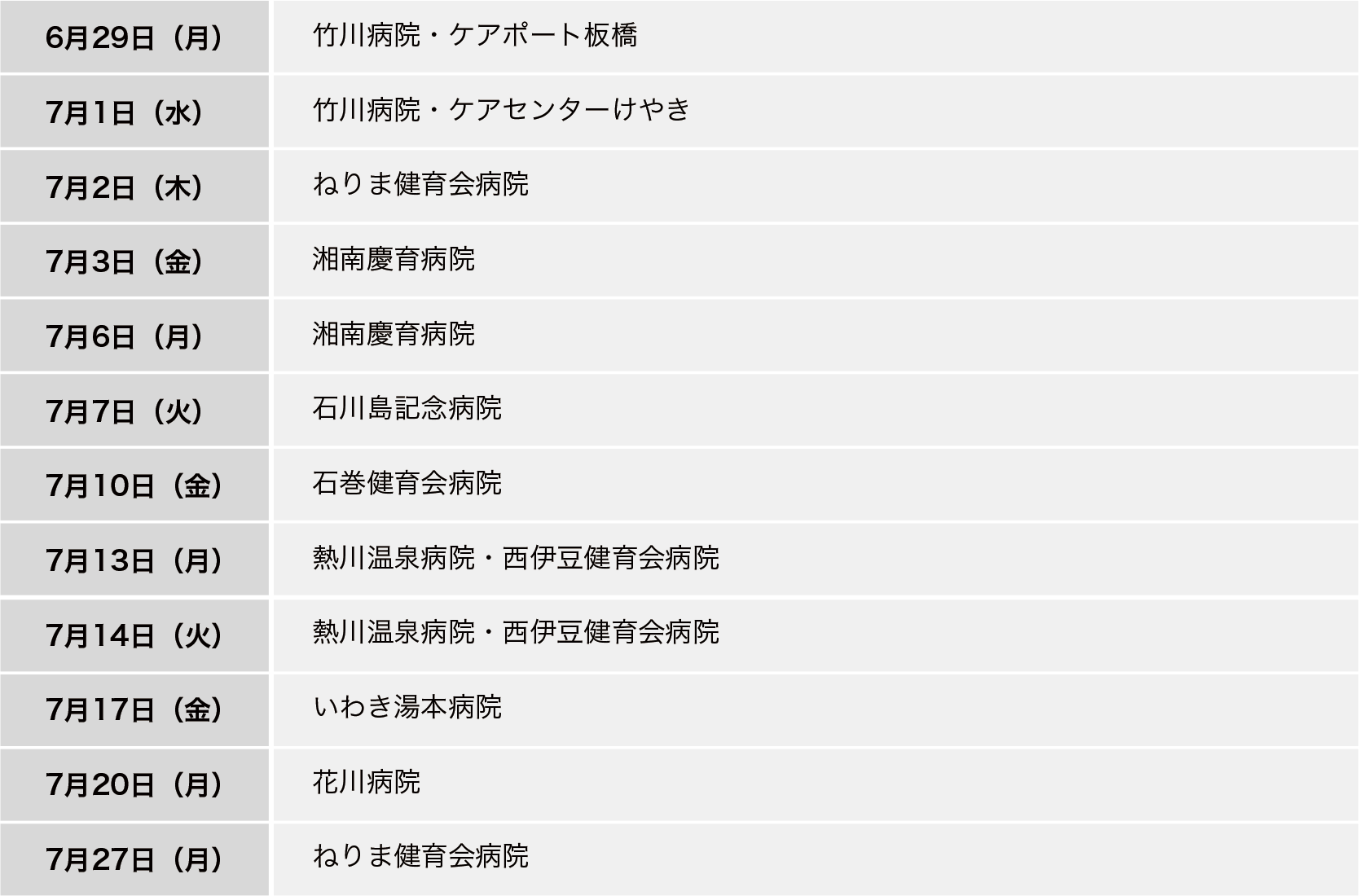 新入職員研修を実施したのは、6月29日から7月27日のうち12日間、計8会場でした。日程は下記の表の通りです。