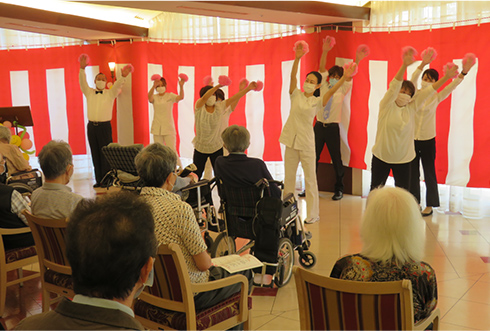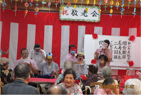 - テーマは「一笑一若」。1回笑えば1歳若返る! コロナ禍でも笑って若返っていただく敬老祝賀会にするという思いを込めて設定しました。今年は新型コロナウイルス感染症予防対策を最優先にして、ご家族や外部の方々によるお祝いは中止せざるを得ませんでした。特定入居部門は2部制に、デイサービスは別会場にして時間をずらし、3密の状態を作らないように会場を常時換気。入場時のアルコール消毒に加えて、ご入居者さんと職員はマスク着用で開催しました。