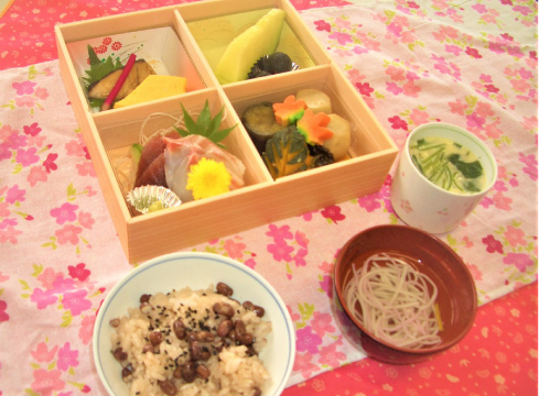 昼食は敬老会限定のスペシャルメニューを用意しました(お赤飯、澄まし汁には紅白の素麺、茶わん蒸し、天ぷら、鯛やまぐろの刺身、炊き合わせ)。食後には巨峰・メロンのフルーツの盛り合わせを味わっていただきました。