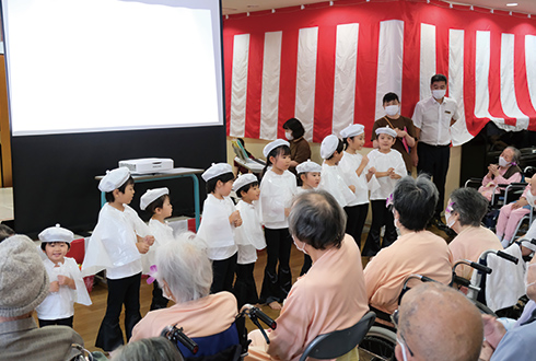 病棟での昼食会は『お祝い御膳』を用意しました。メニューは「お赤飯、地魚の刺身三点盛り、ヒレカツ、金目鯛の漬け焼き、生フルーツ」。栄養科職員が心を込めて用意した料理を、患者さん・ご家族が美味しそうに召し上がっていました。またイベントでは、まず保育所児童による『おんせんたまご少年少女合唱団 ~ やなせたかしワールド ~』。絵本「やさしいライオン」の朗読と「手にひらを太陽に」「アンパンマンのマーチ」を合唱してくれました。続いて104歳を筆頭に90歳以上29名の方を対象にご長寿表彰式を行いました。