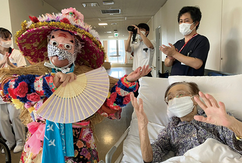 午後は、外部ボランティアの方々が各病棟に赴いて、「ひょっとこ踊り」をご披露いただきました。煌びやかな衣装とひょっとこのお面というアンバランスないでたちの踊り手さんが、滑稽なしぐさで患者さん一人一人と交流して頂き、大笑いする方、思わず涙する方こもごもの、温かく楽しい時間を過ごすことができました。