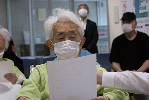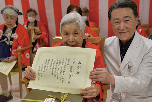 はじめに米寿を迎える患者さん2名、90歳以上の患者さん12名に長寿の表彰を行いました。表彰された患者さんひとりひとりに質問をする即席コーナーをもうけ、表彰式がプロ野球のヒーローインタビューさながらの盛り上がりとなりました。