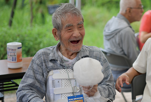 今年は、病院内にあるガーデンで職員によるかき氷・綿あめ・ドリンク提供を行い、ご家族と共に楽しんでいただきました。少量ですがアルコール提供もでき、普段は笑わない患者さんが笑顔になるなど見られ、担当職員が感動している姿が印象的でした。