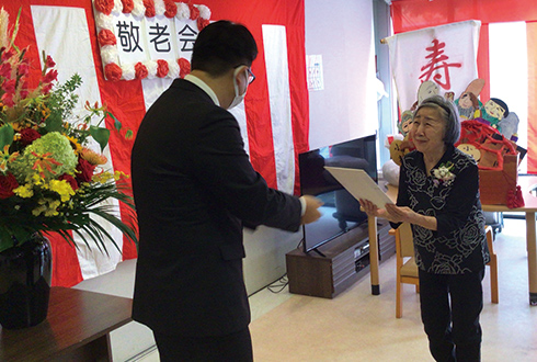 デイサービスでも式典を行い7名の節目の方を表彰し、その際初来所の方も節目でしたので表彰すると、本人はとても驚いておりましたが感謝いたしますとお言葉をもらえました。その後板橋区で活躍されている「演歌のえっちゃん」をお呼びして、歌謡曲を皆さんの前で歌っていただき、生ギター演奏の曲を前に喜んでいただきました。