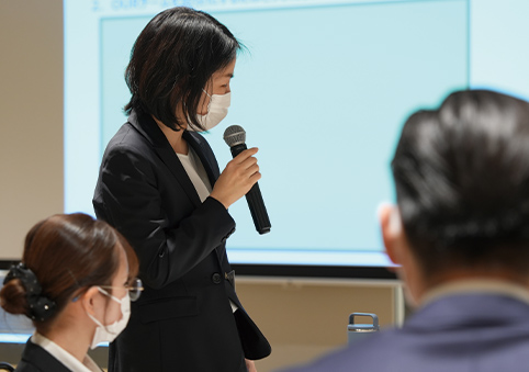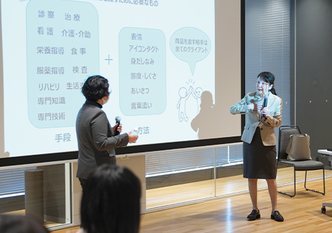その後行われた、ビーフォーシーの相部博子先生による講義では、チーム力を活性化し、生産性を引き出す情報共有の方法や、クライアントの心を豊かにする接遇について、ディスカッションも交えて学んでもらいました。