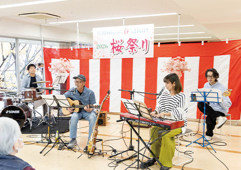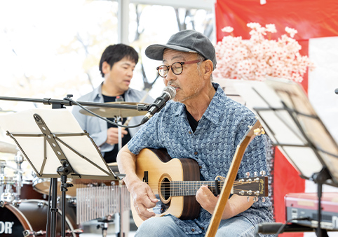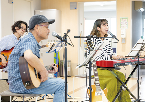 演奏会では1曲目にBEGINの「島人ぬ宝」をお送りしました。私がアコースティックギターを演奏し、メロディを歌い上げる中、患者さんやご利用者は、合間にかけ声を上げながら、一緒に演奏を盛り上げてくださいました。