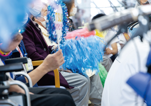 ラストは、チューリップの「心の旅」を演奏しました。エレキギターによる力強い演奏は皆さんの心を刺激し、手拍子やポンポンを振る手にもよりパワーがみなぎっていました。